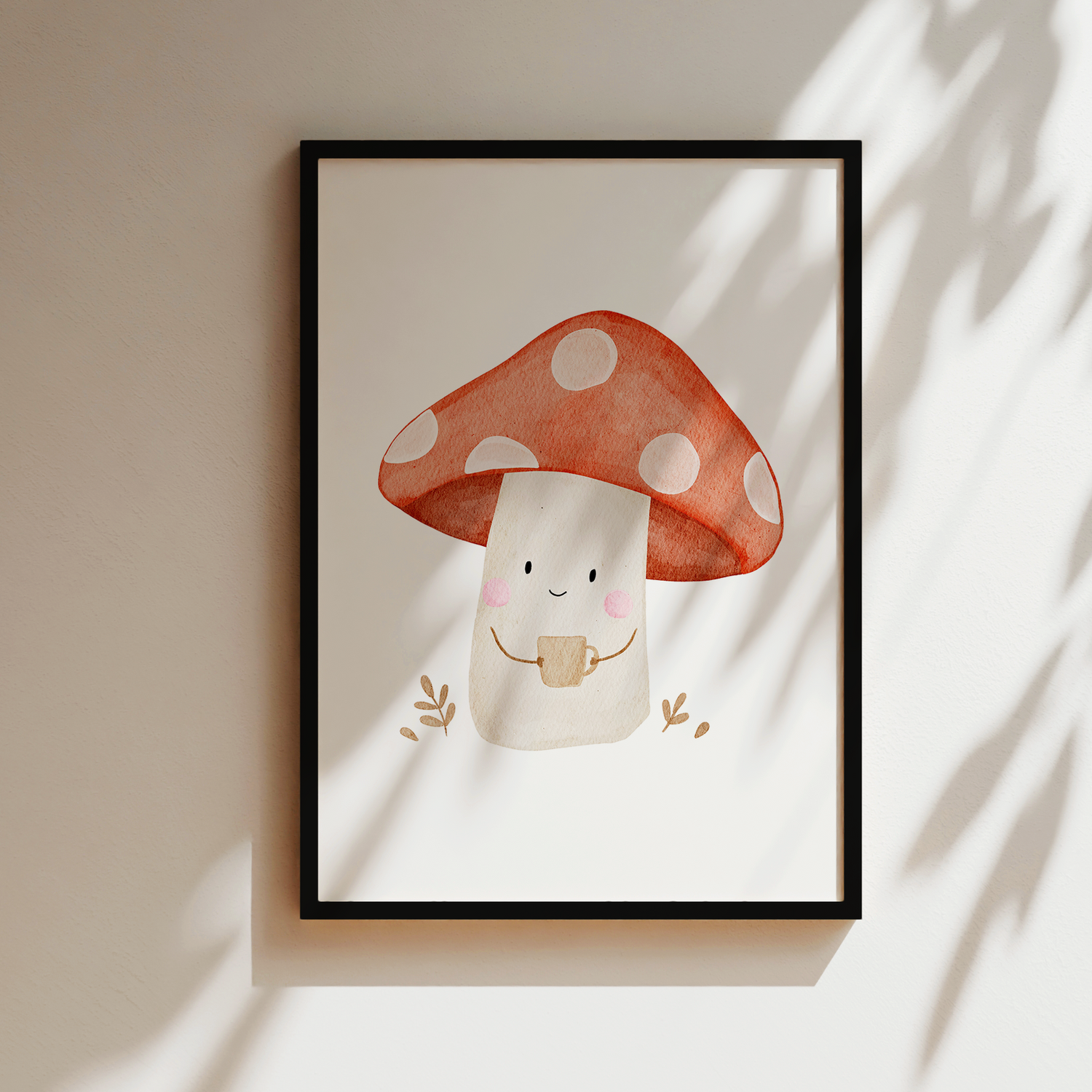 Poster kleiner Pilz mit Kaffeetasse - liebevolle Herbstdeko fürs Kinderzimmer 🍄☕