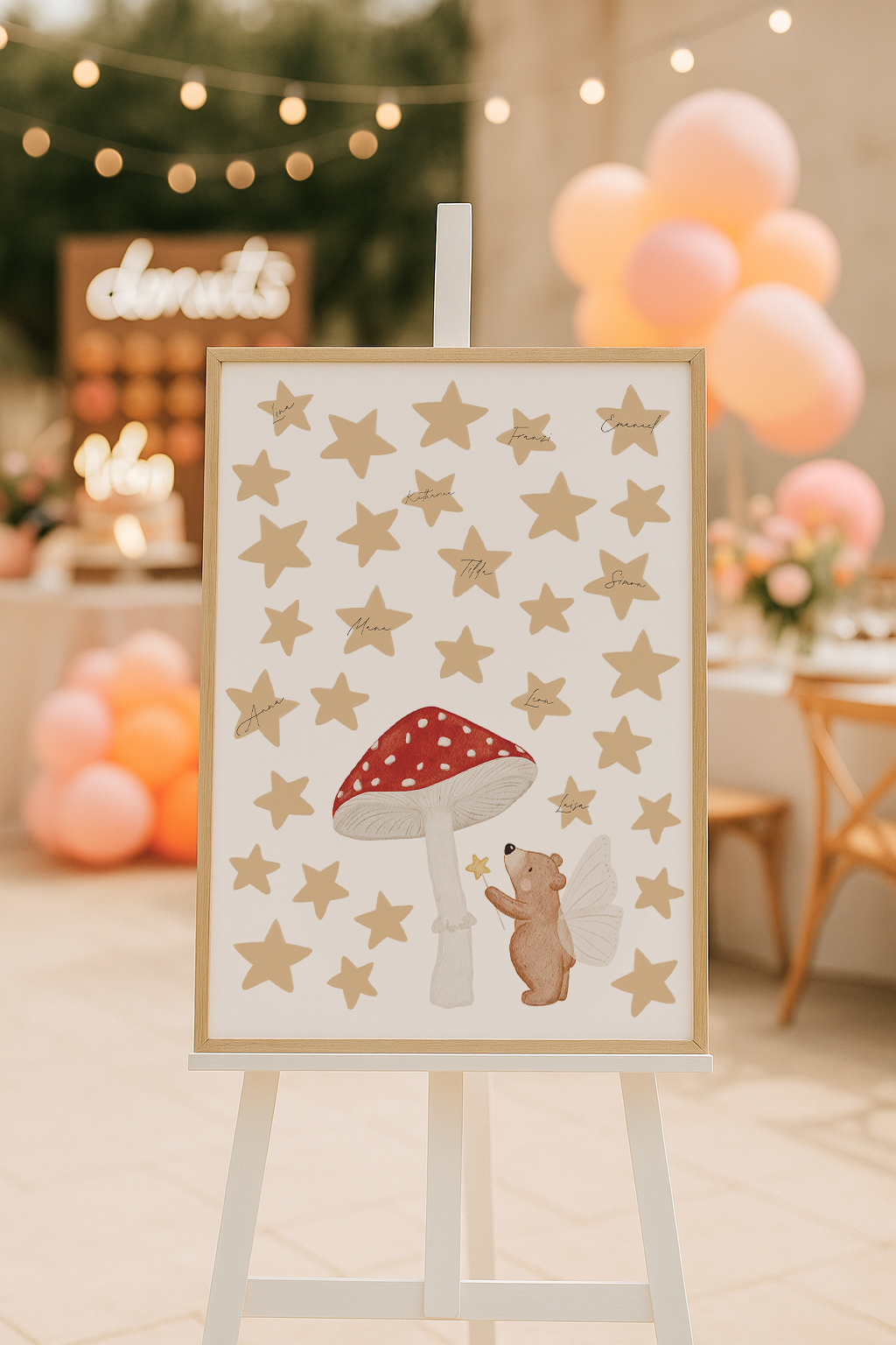 Gästeposter kleiner Pilzbär mit Sternen - Waldtierposter für Babyzimmer oder Babyparty 🐻🍄