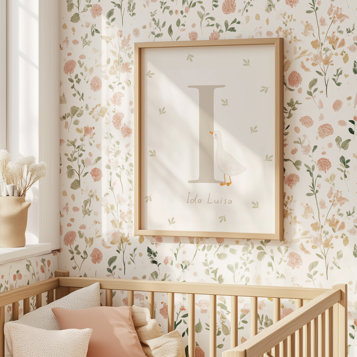 Dieses niedliche Poster zeigt den Anfangsbuchstaben des Namens, begleitet von einer liebevoll illustrierten kleinen Gans. Darunter wird der Name des Kindes ergänzt - ein ganz persönliches Detail für jedes Kinderzimmer.