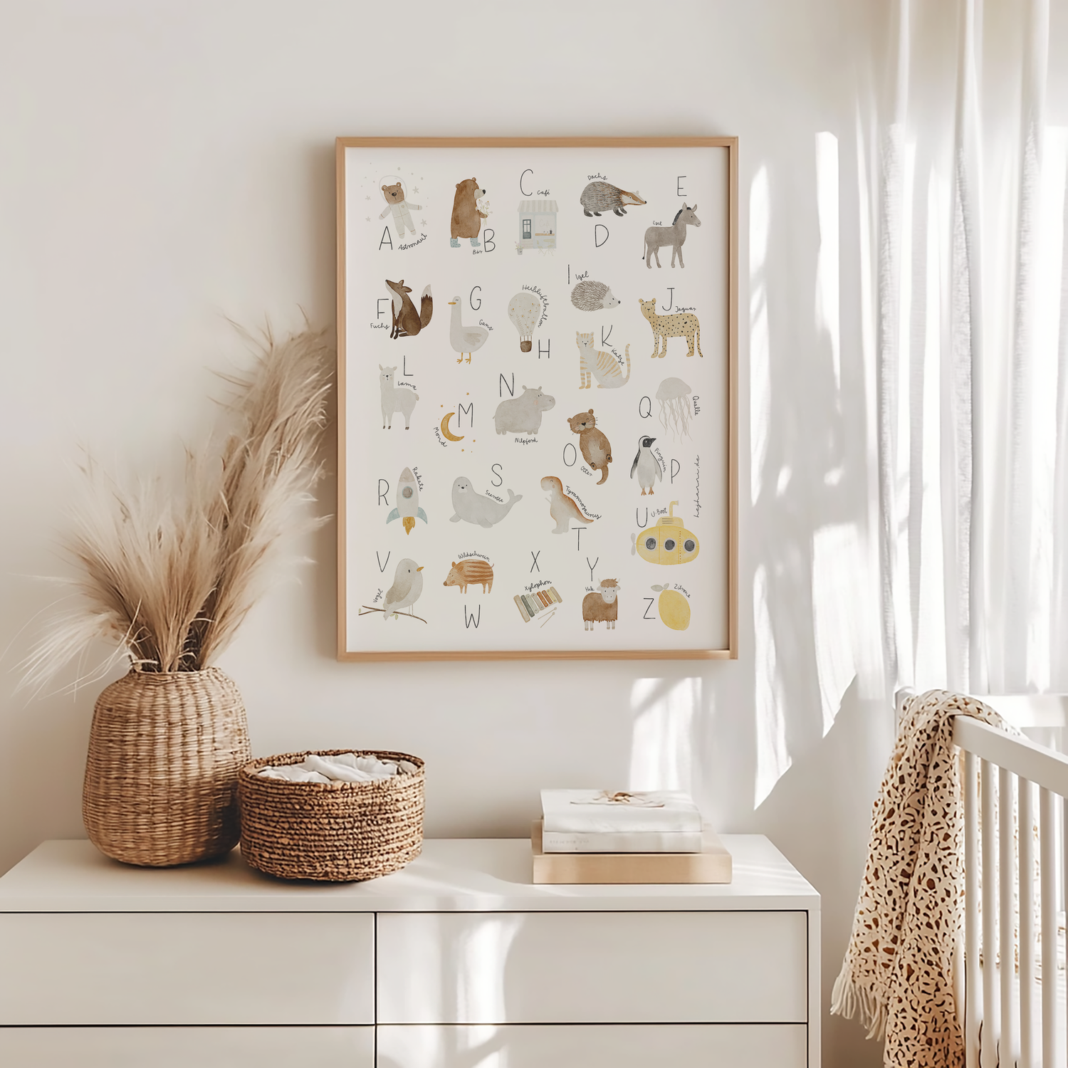 Alphabet-Poster mit liebevollen Illustrationen von A wie Astronaut bis Z wie Zitrone - mit Tieren und Motiven wie Bär, Gans, Nilpferd, U-Boot, Yak und Xylophon. Perfekt zum Buchstaben lernen und Tiere entdecken.