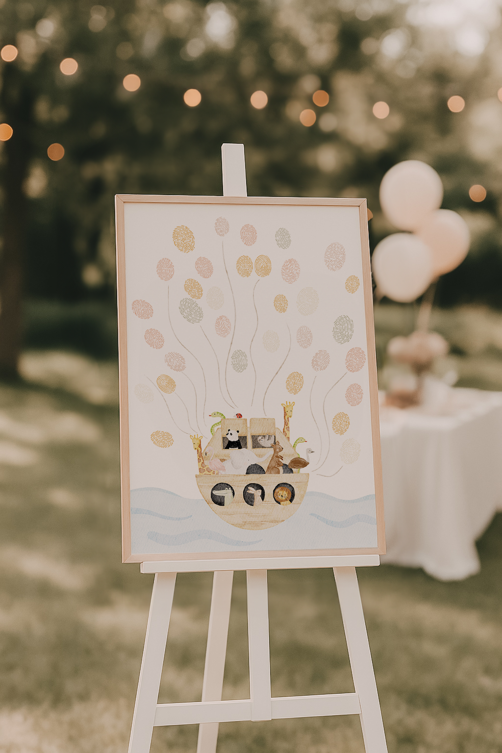 Die Arche Noah ohne vorgedruckte Ballons bietet viel Platz für Fingerabdrücke - eure Gäste lassen durch ihre Abdrücke nach und nach bunte Luftballons entstehen. Das Poster eignet sich ideal zur Taufe, Babyparty, Geburt oder dem ersten Geburtstag und wird danach zu einem besonderen Erinnerungsstück im Kinderzimmer.