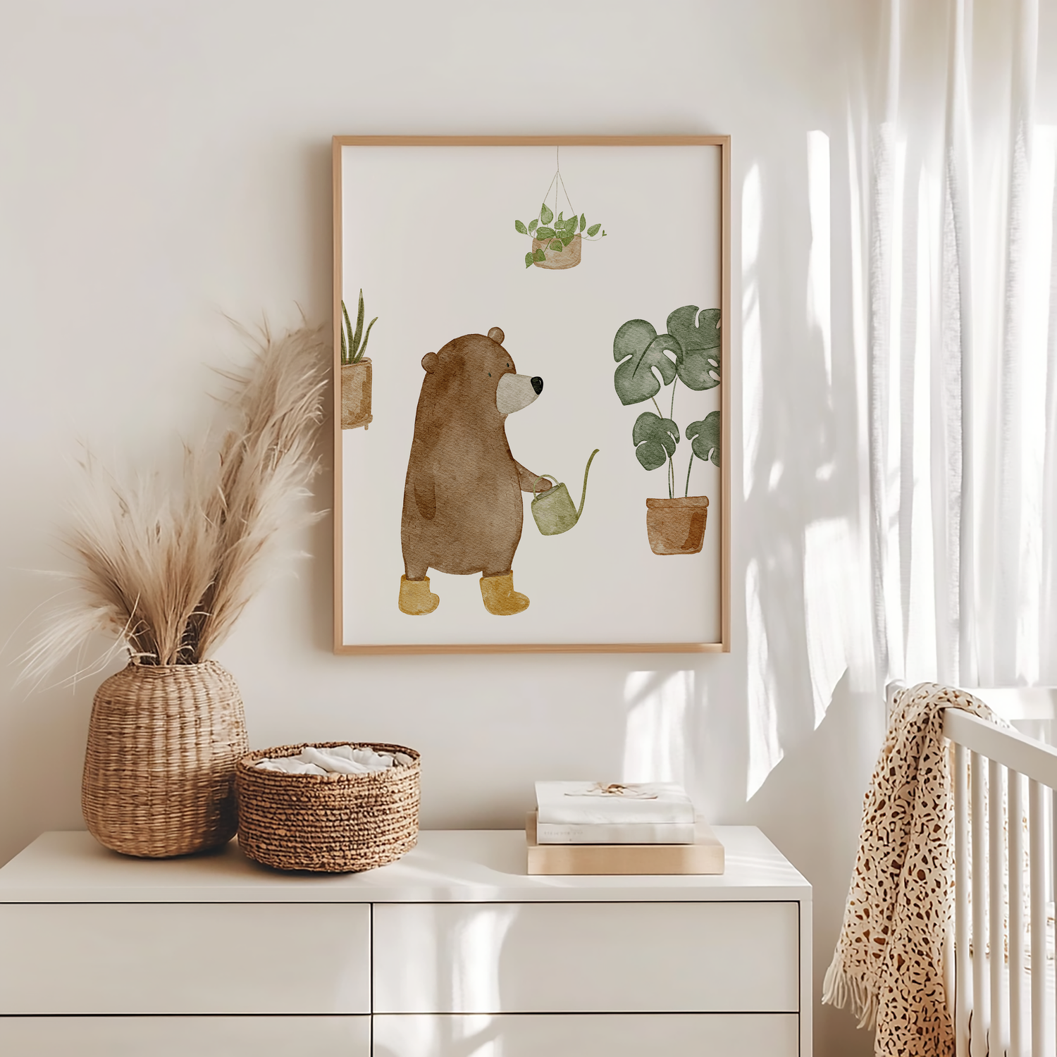 • Ein liebevoll illustriertes Poster mit Bär und Zimmerpflanzen – für kleine Pflanzenfans