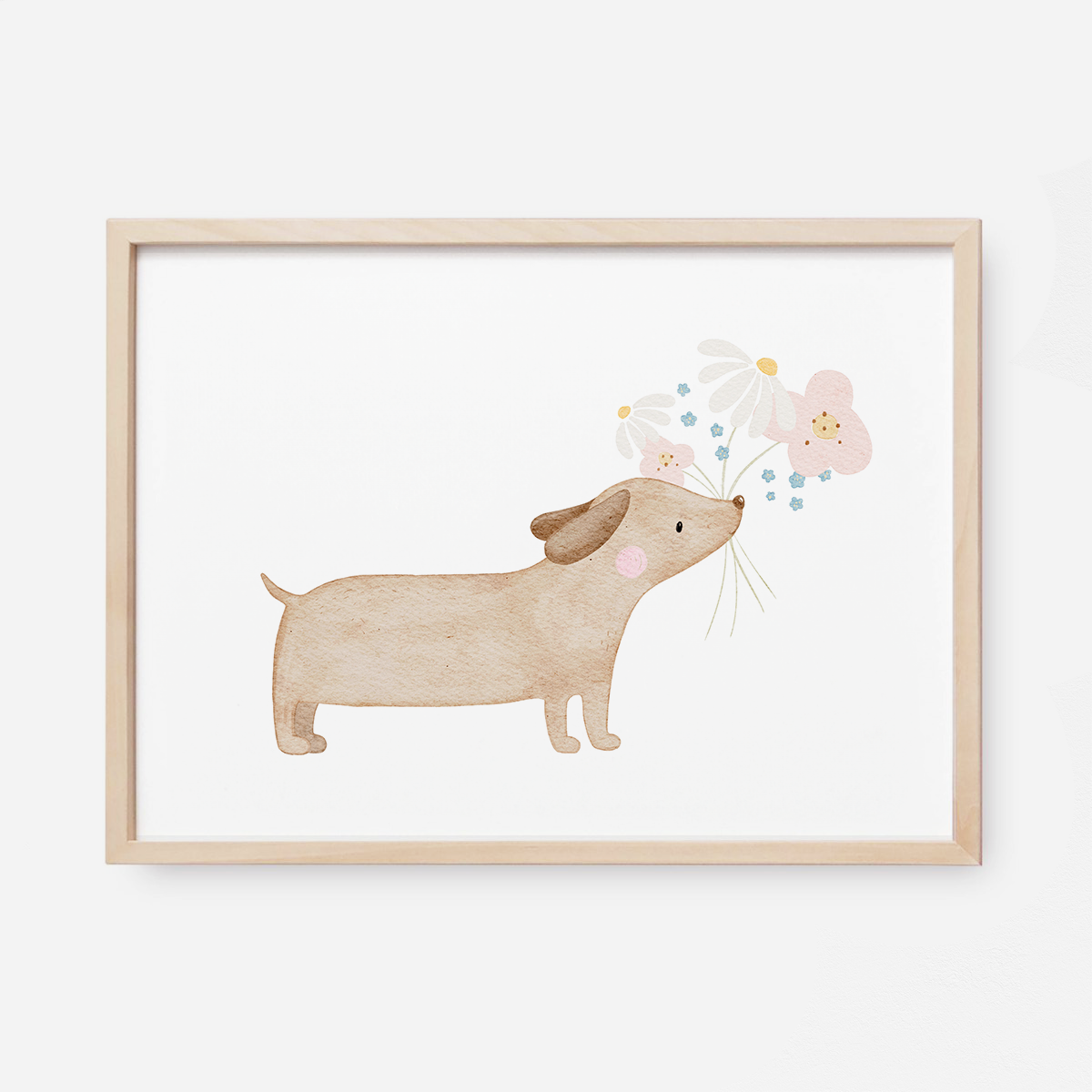 • Kinderzimmerposter Dackel Blumen - liebevoll illustriertes Tierposter für Kinder