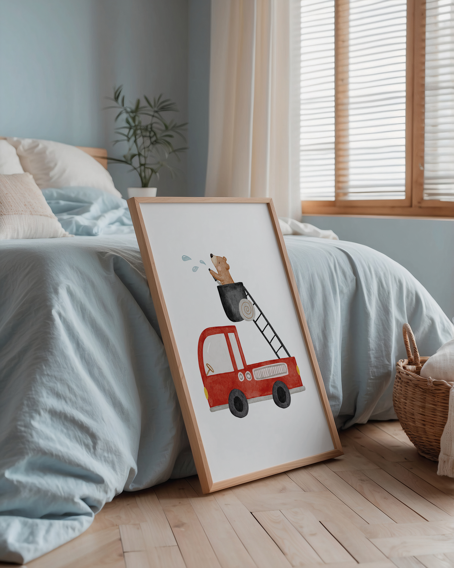 • Kinderzimmerposter mit Feuerwehrfahrzeug und Bär – liebevolles Motiv für kleine Feuerwehrfans