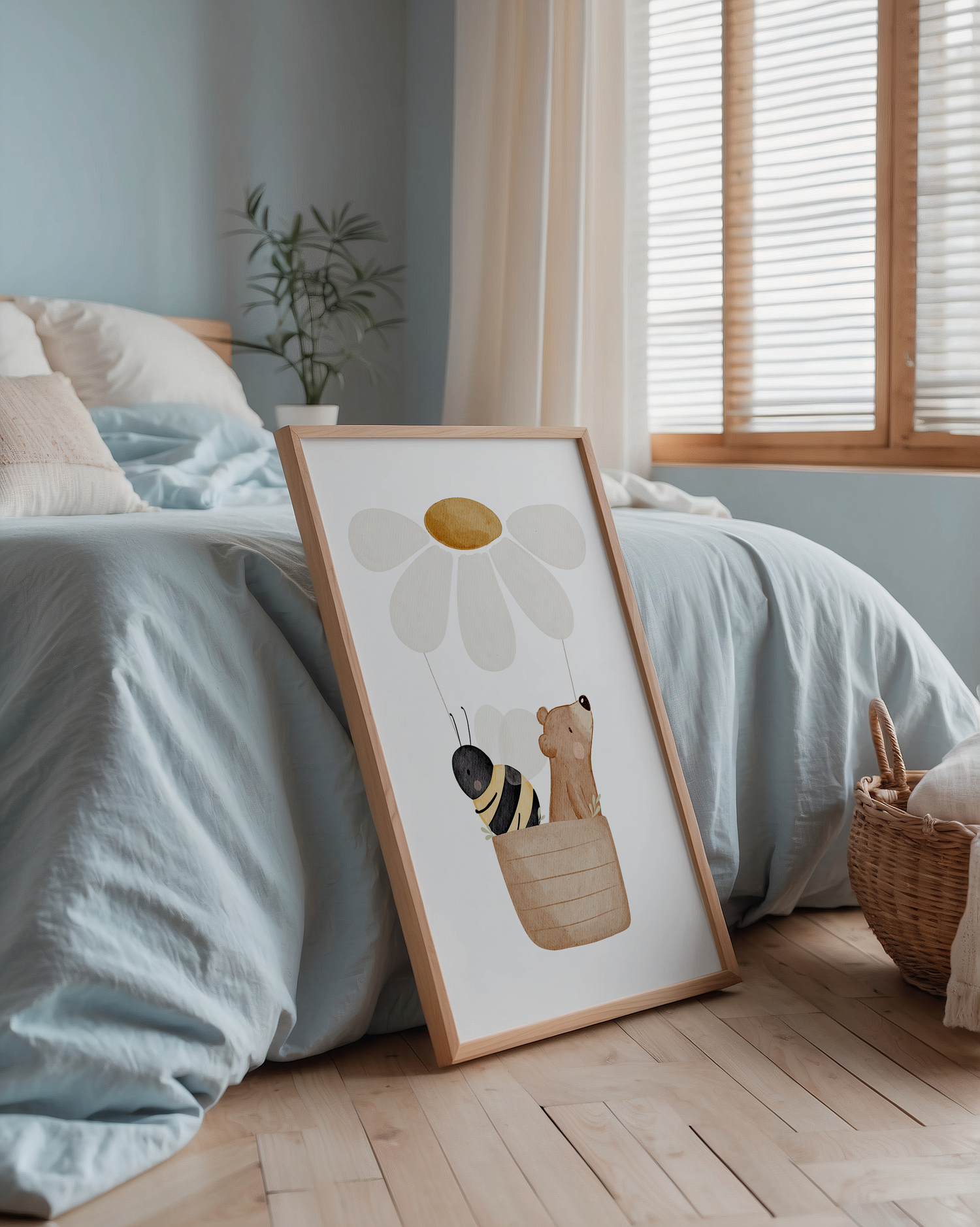 • Kinderzimmer Poster mit Bär, Biene und Gänseblümchen-Ballon – für Bett, Wickelplatz oder Spielecke