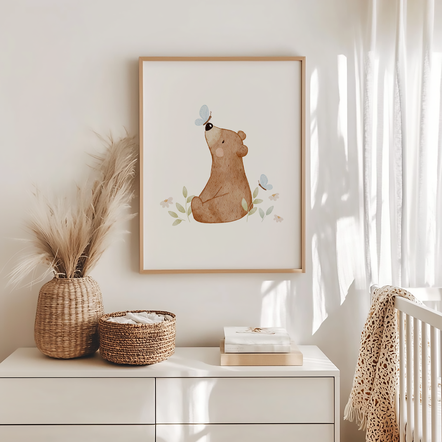 • Kinderzimmerposter kleiner Bär mit Schmetterlingen - ein liebevolles Frühlingsposter für Babyzimmer oder Kinderzimmer
