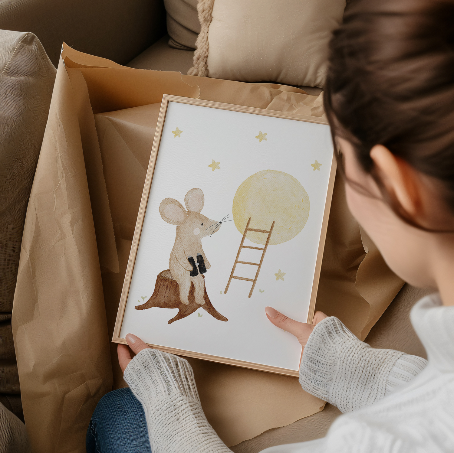 Die kleine Maus mit Fernglas, Leiter und Mond macht dieses Poster zu einer schönen Ergänzung im Kinderzimmer oder Babyzimmer. Besonders gut passt es in eine ruhige Ecke, zum Beispiel über die Kuschelecke oder ans Bett. Auch als Geschenk zur Geburt oder Taufe ist dieses Poster beliebt.