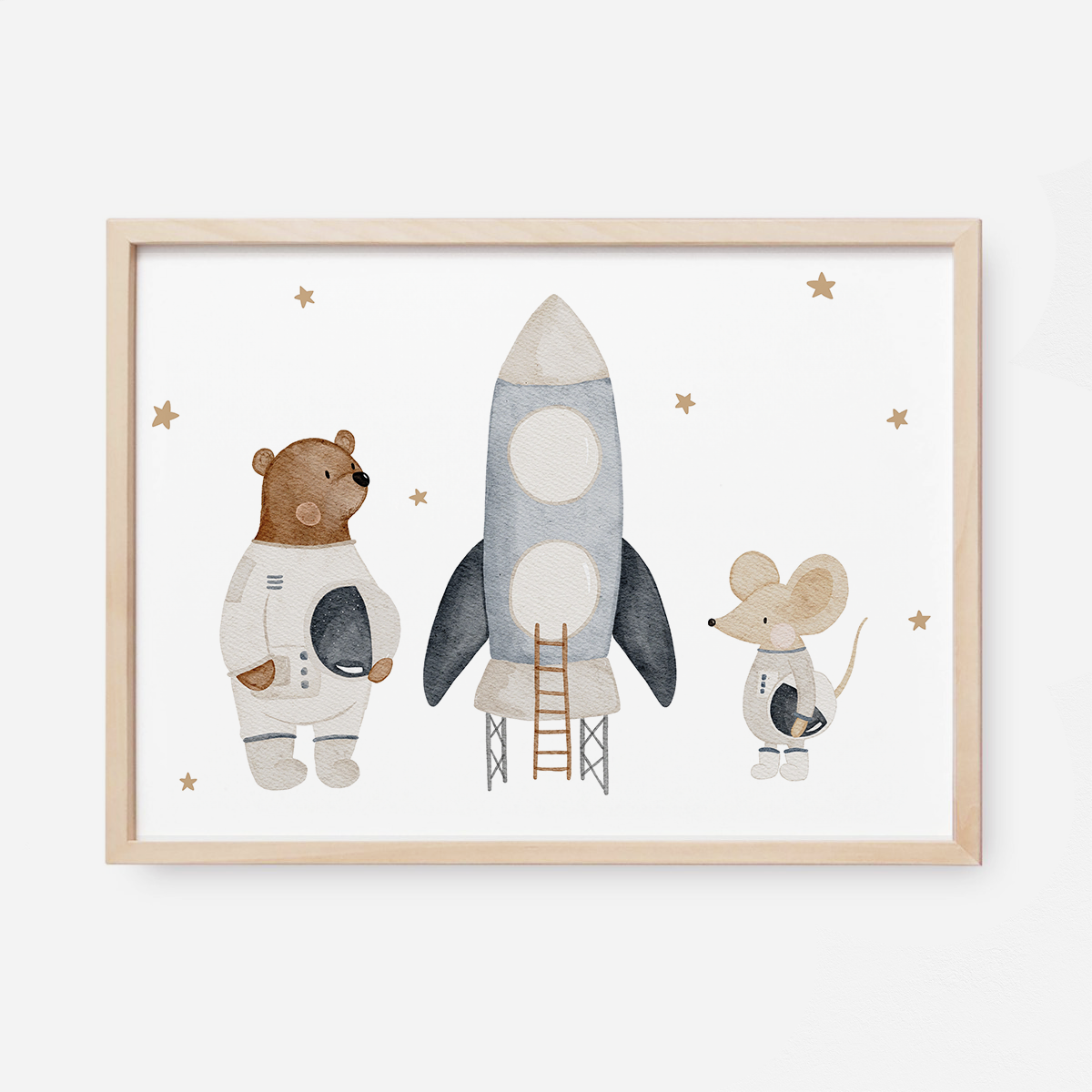 Bereit für den Raketenstart? Der kleine Bär und seine Mausfreundin haben ihre Raumanzüge an und stehen schon bereit - das Poster ist wie gemacht für alle Kinder, die vom Weltall träumen.