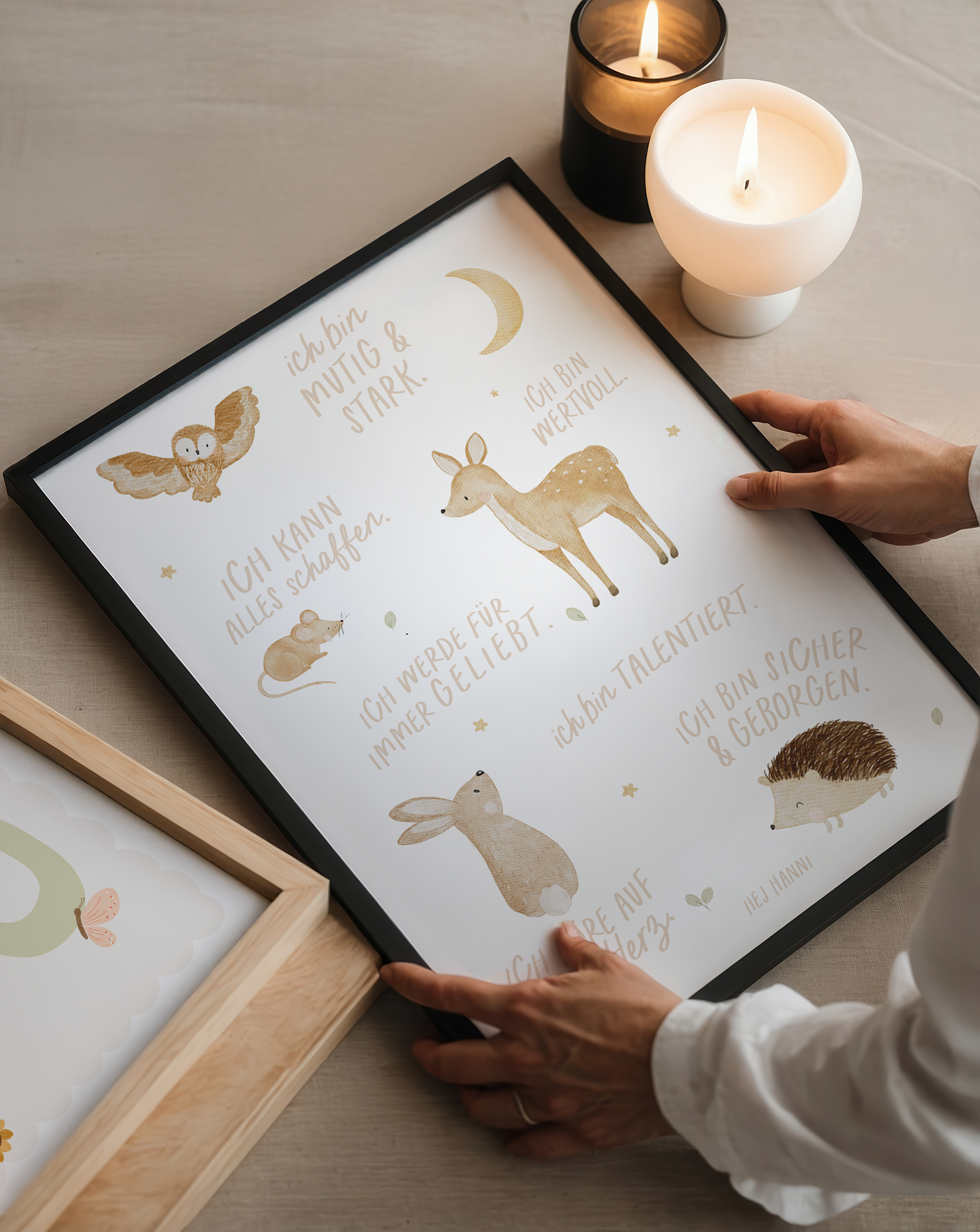 Poster mit Affirmationen wie „Ich bin mutig & stark“ und „Ich werde für immer geliebt“ - kombiniert mit Waldtieren wie Reh, Hase, Eule, Igel und Maus. Perfekt für Kinderzimmer mit Naturmotiven oder als liebevolle Deko im Babyzimmer.